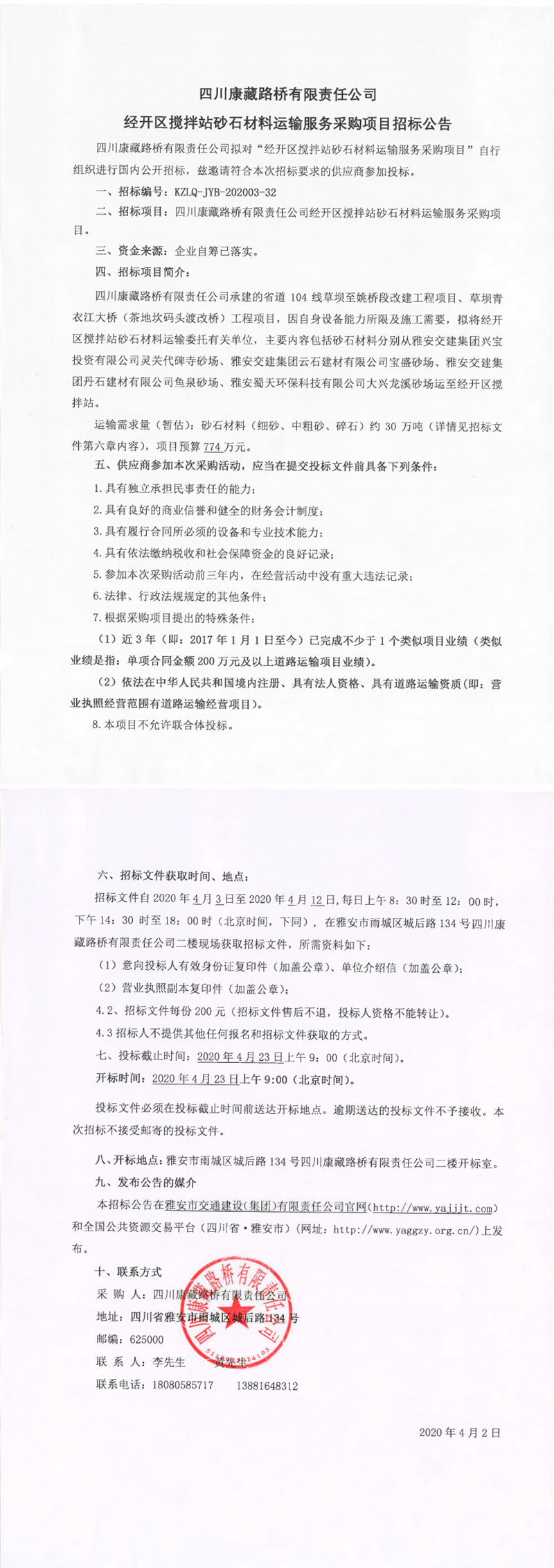 四川康藏路橋有限責(zé)任公司經(jīng)開區(qū)攪拌站砂石材料運輸服務(wù)采購項目招標(biāo)公告