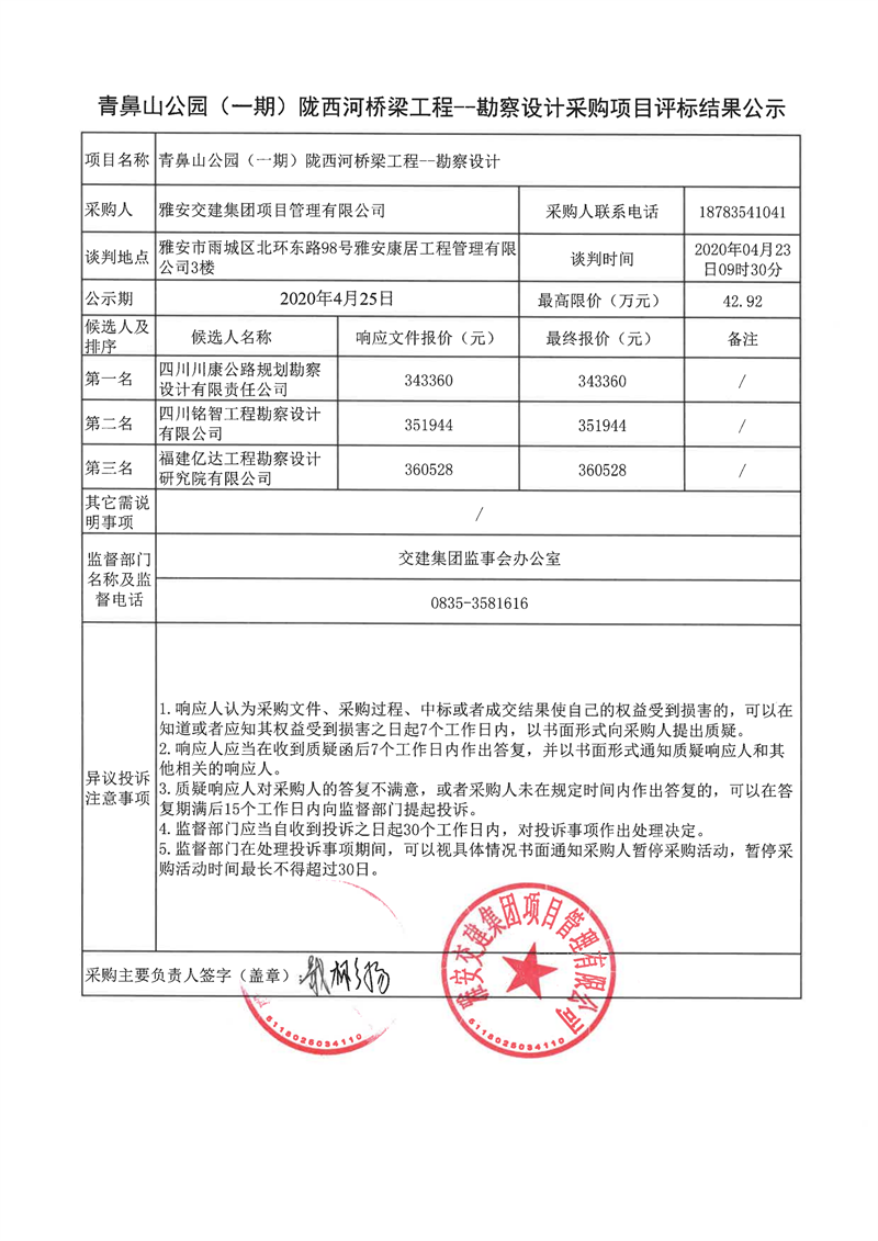 雅安交建集團(tuán)項(xiàng)目管理有限公司青鼻山公園(一期)隴西河橋梁工程項(xiàng)目勘察設(shè)計(jì)采購(gòu)項(xiàng)目評(píng)標(biāo)結(jié)果公示
