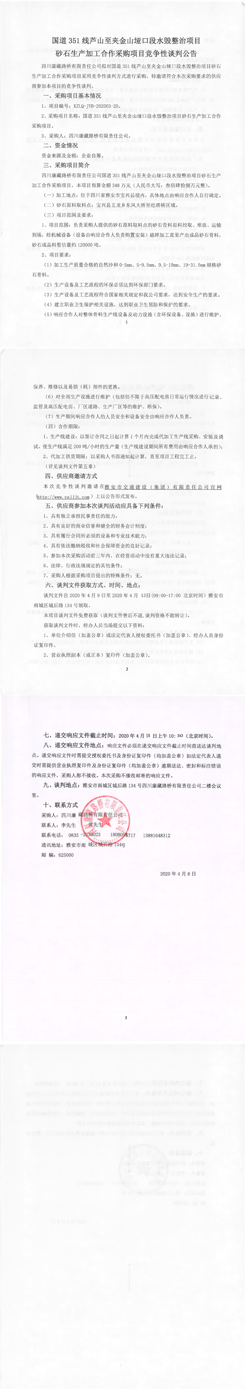 四川康藏路橋有限責(zé)任公司國道351線蘆山至夾金山埡口段水毀整治項(xiàng)目砂石生產(chǎn)加工合作采購項(xiàng)目競爭性談判公告