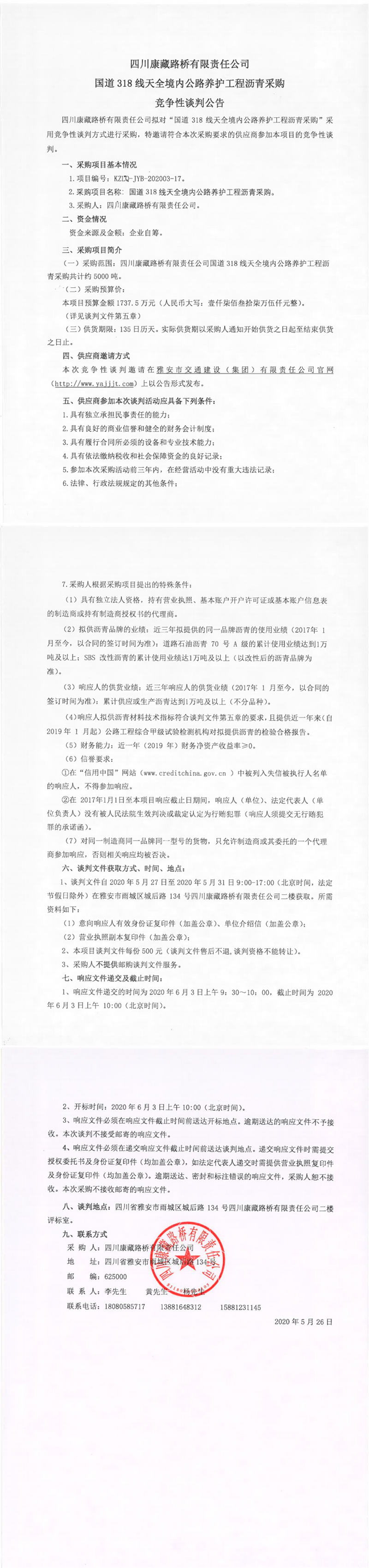 四川康藏路橋有限責(zé)任公司國(guó)道318線(xiàn)天全境內(nèi)公路養(yǎng)護(hù)工程瀝青采購(gòu)競(jìng)爭(zhēng)性談判公告