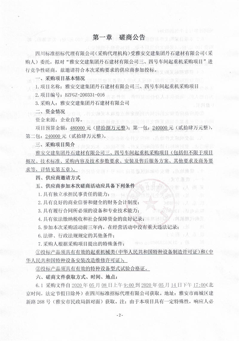 雅安交建集團(tuán)丹石建材有限公司三、四號(hào)車間起重機(jī)采購(gòu)項(xiàng)目競(jìng)爭(zhēng)性磋商公告