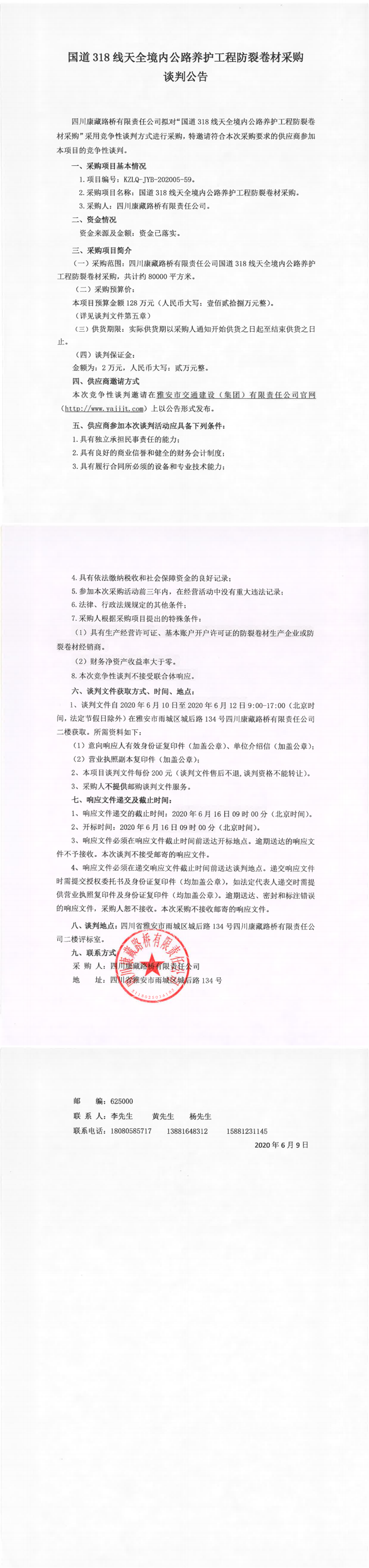 四川康藏路橋有限責(zé)任公司國道318線天全境內(nèi)公路養(yǎng)護(hù)工程防裂卷材采購競爭性談判公告