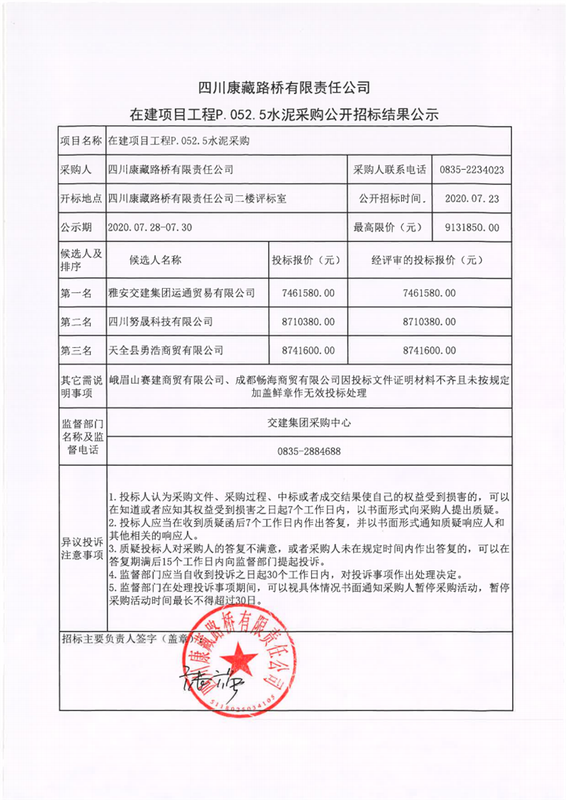四川康藏路橋有限責任公司在建項目工程P.052.5水泥采購公開招標結(jié)果公示