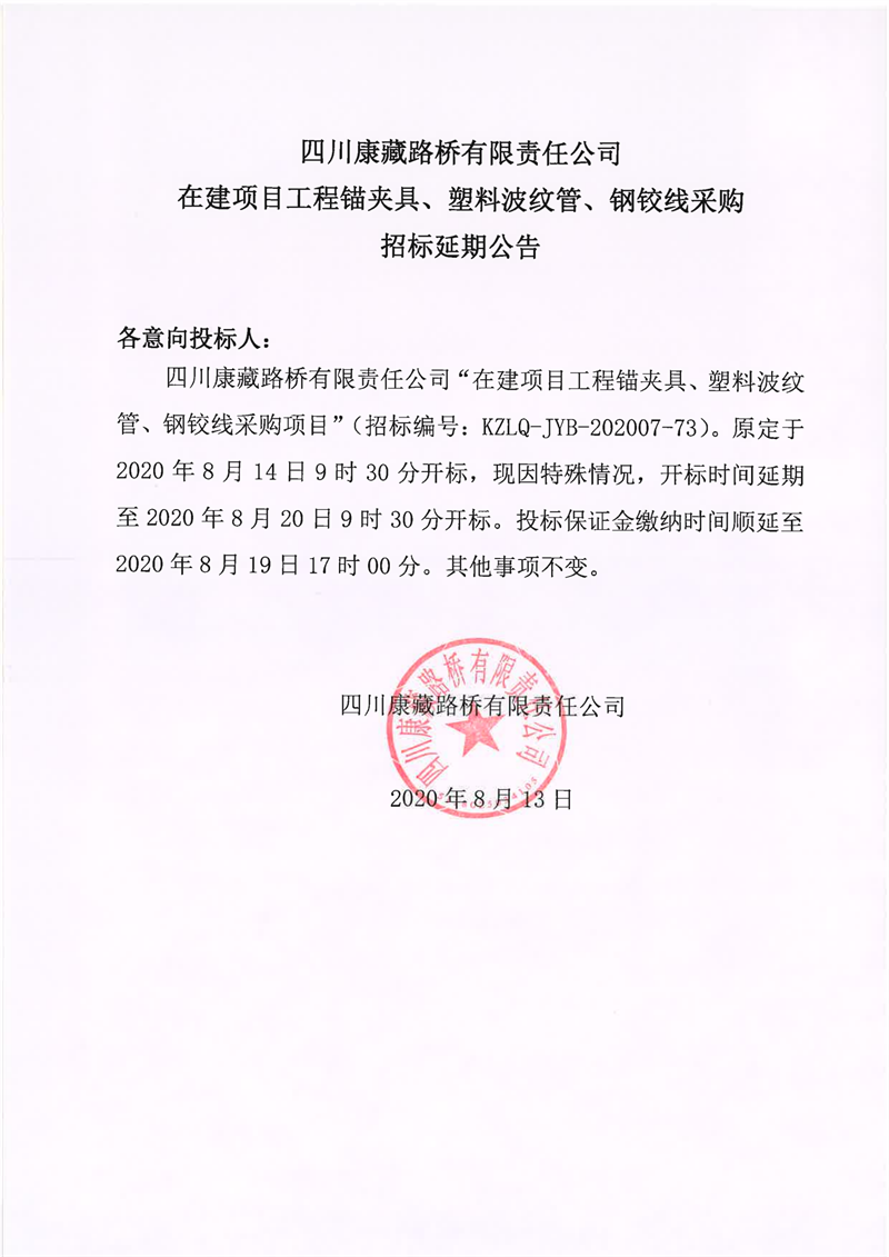 四川康藏路橋有限責任公司在建項目工程錨夾具、塑料波紋管、鋼鉸線采購招標延期公告