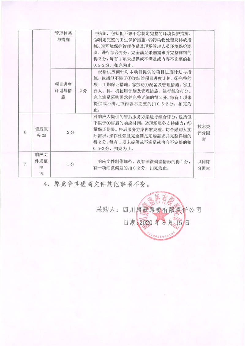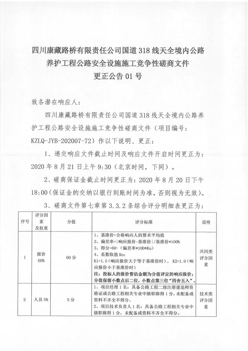 四川康藏路橋有限責(zé)任公司國道318線天全境內(nèi)公路養(yǎng)護(hù)工程公路安全設(shè)施施工競爭性磋商文件更正公告01號(hào)