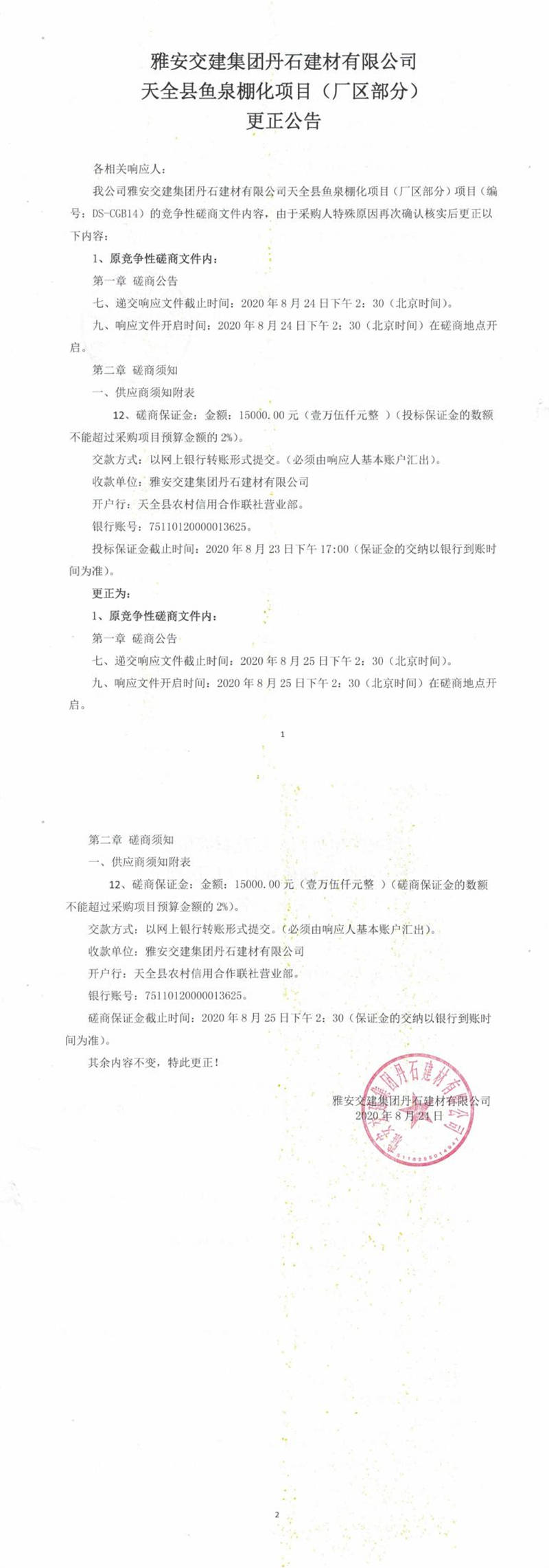 雅安交建集團(tuán)丹石建材有限公司天全縣魚泉棚化項(xiàng)目(廠區(qū)部分)更正公告