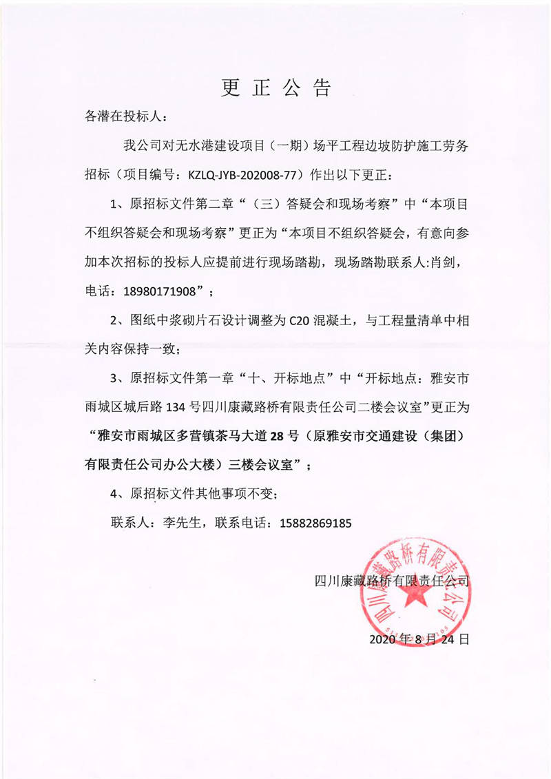 四川康藏路橋有限責任公司無水港建設項目(一期)場平工程邊坡防護施工勞務招標更正公告