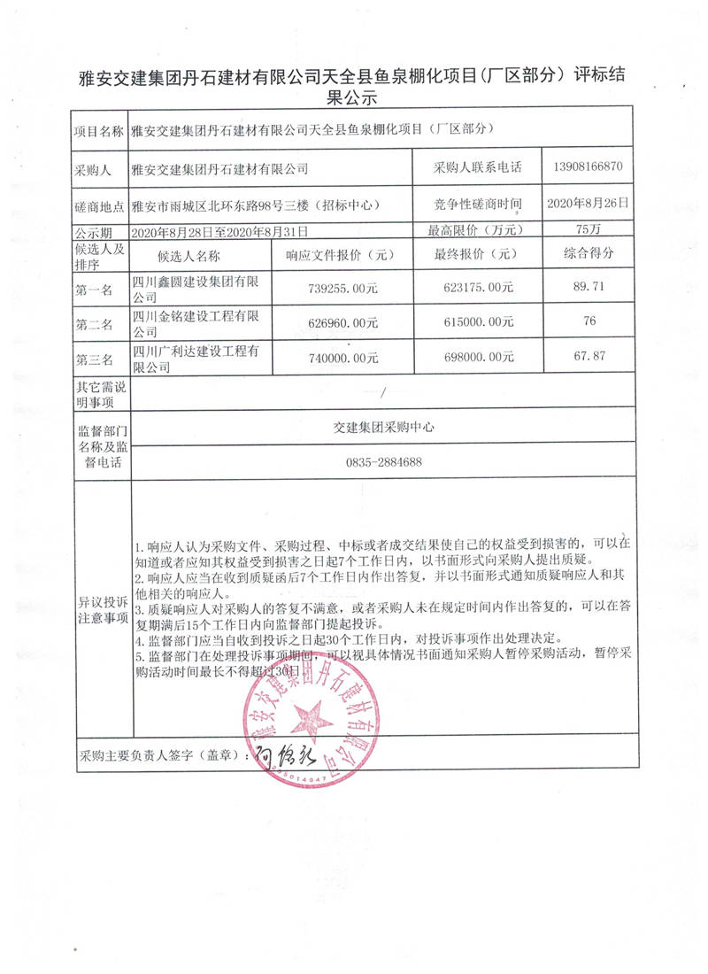 雅安交建集團(tuán)丹石建材有限公司天全縣魚(yú)泉棚化項(xiàng)目(廠區(qū)部分)評(píng)標(biāo)結(jié)果公示