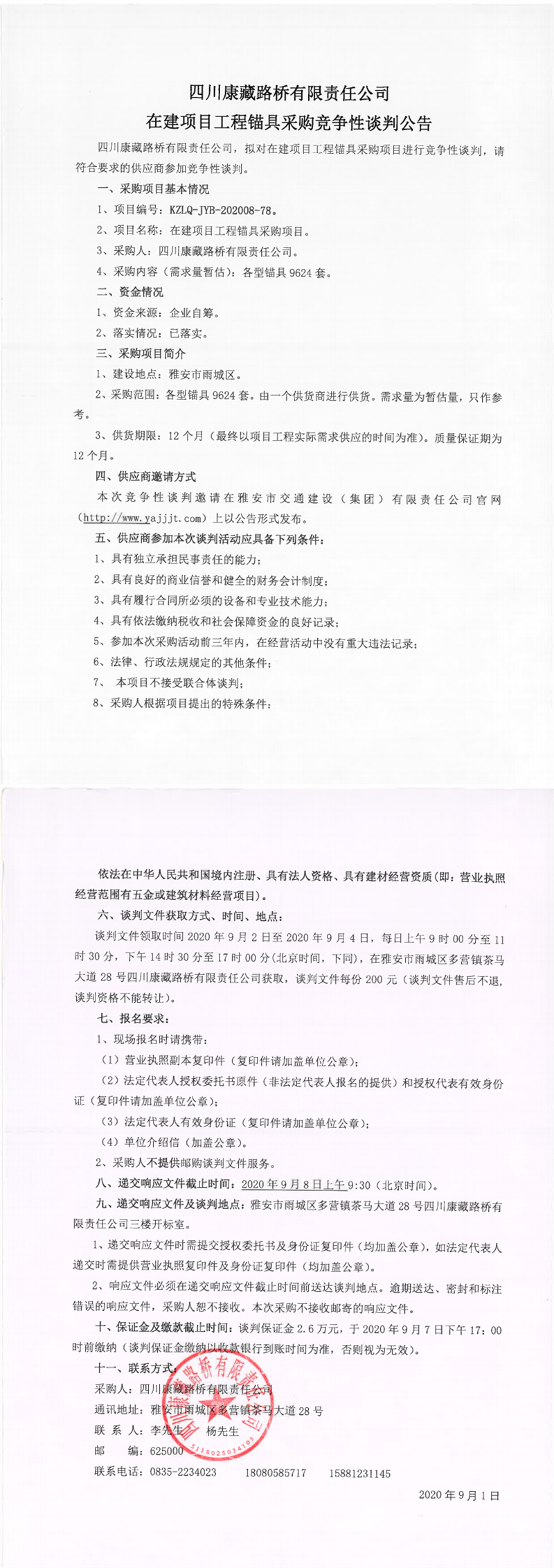 四川康藏路橋有限責任公司在建項目工程錨具采購競爭性談判公告