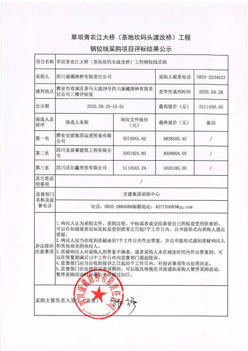 四川康藏路橋有限責(zé)任公司草壩青衣江大橋(茶地坎碼頭渡改橋)工程鋼鉸線采購(gòu)項(xiàng)目評(píng)標(biāo)結(jié)果公示
