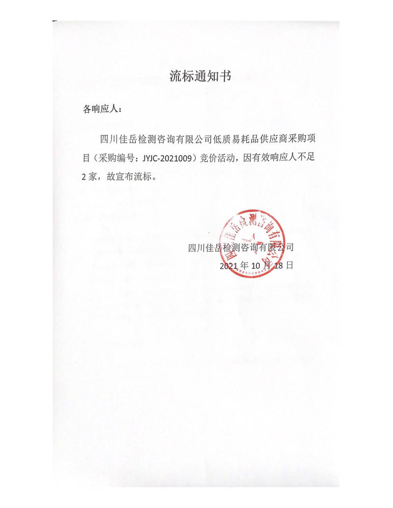 四川佳岳檢測咨詢有限公司低質(zhì)易耗品供應商采購項目流標通知