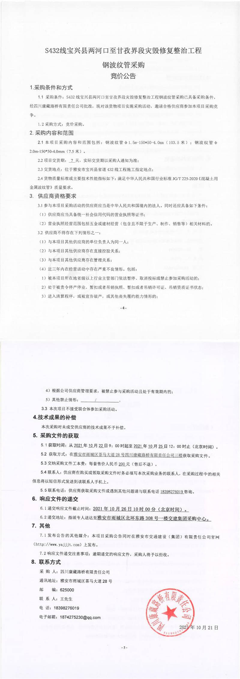四川康藏路橋有限責(zé)任公司S432線寶興縣兩河口至甘孜界段災(zāi)毀修復(fù)整治工程鋼波紋管采購競價(jià)公告