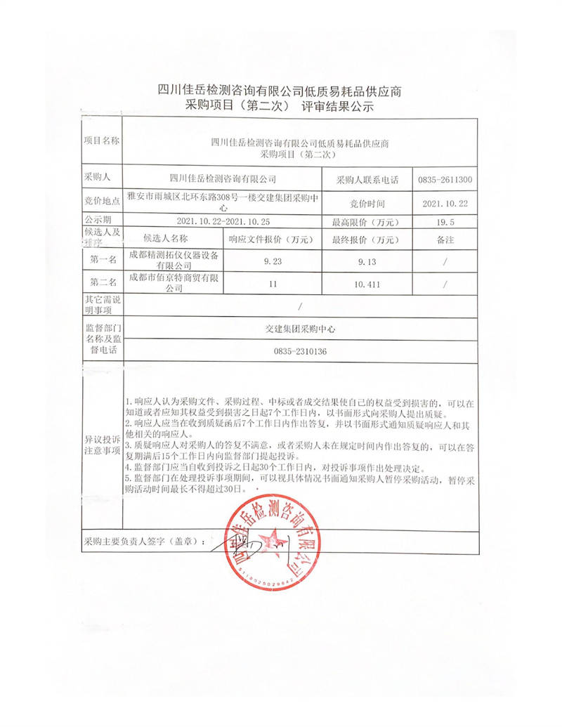 四川佳岳檢測(cè)咨詢有限公司低質(zhì)易耗品供應(yīng)商采購項(xiàng)目(第二次)評(píng)審結(jié)果公示
