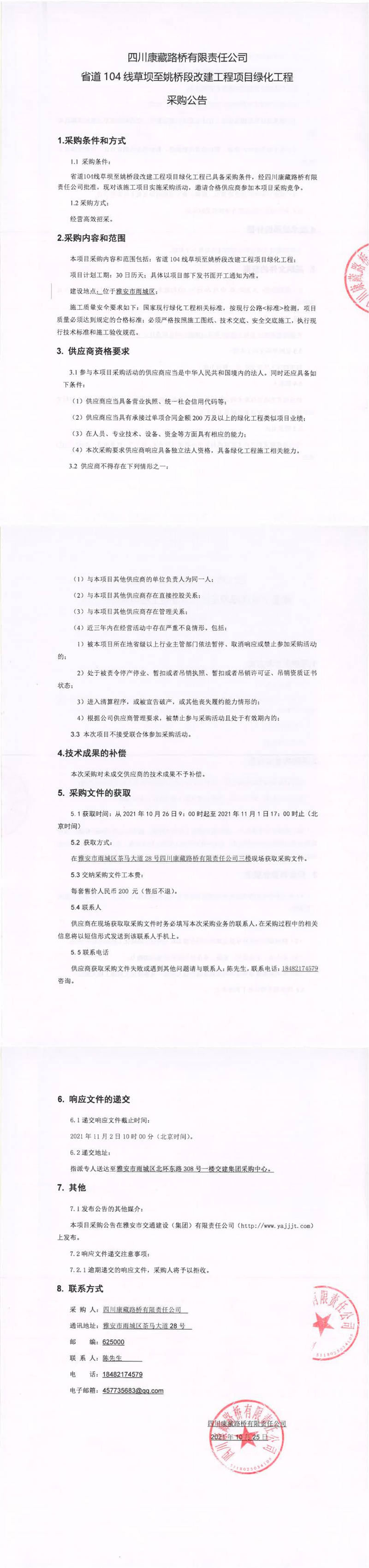 四川康藏路橋有限責任公司省道104線草壩至姚橋段改建工程項目綠化工程采購公告
