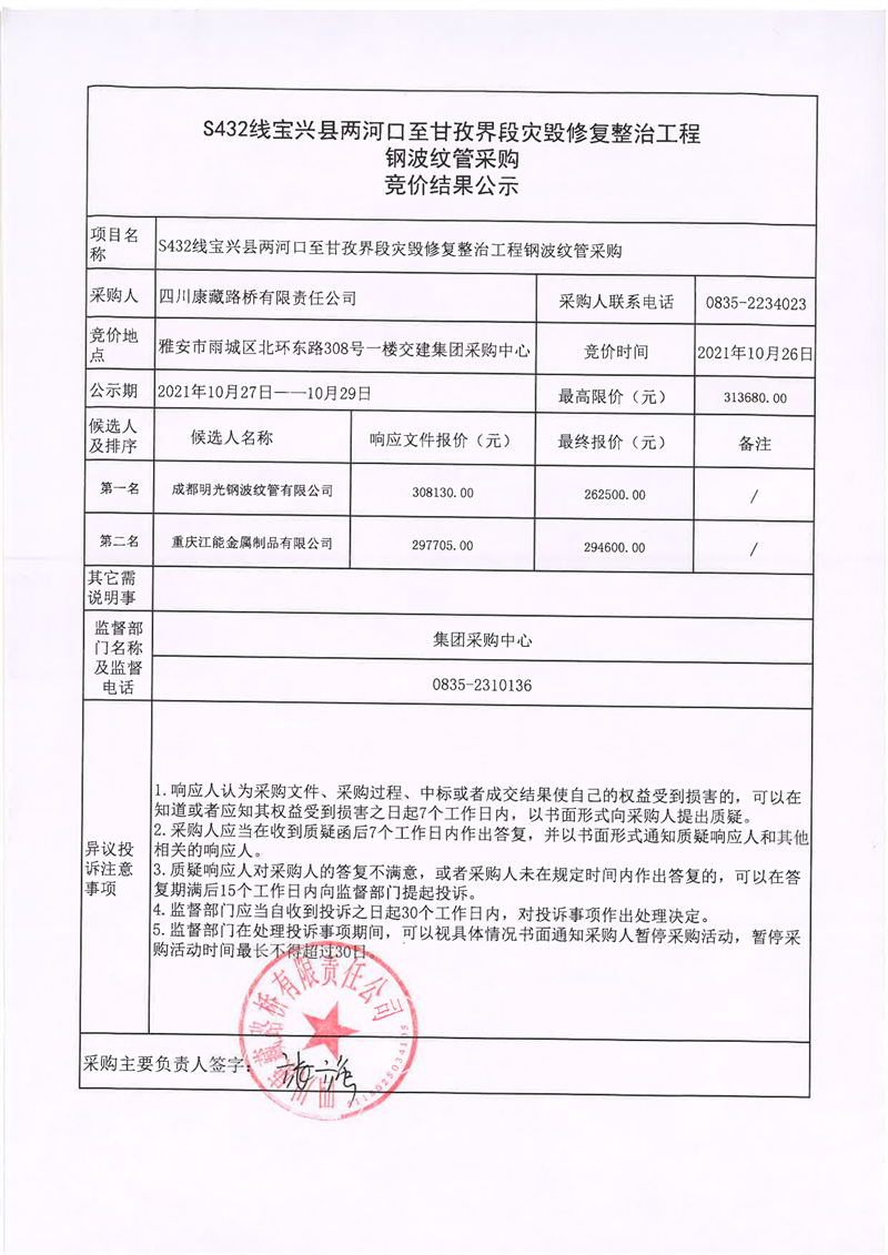 四川康藏路橋有限責(zé)任公司S432線寶興縣兩河口至甘孜界段災(zāi)毀修復(fù)整治工程鋼波紋管采購競價(jià)結(jié)果公示