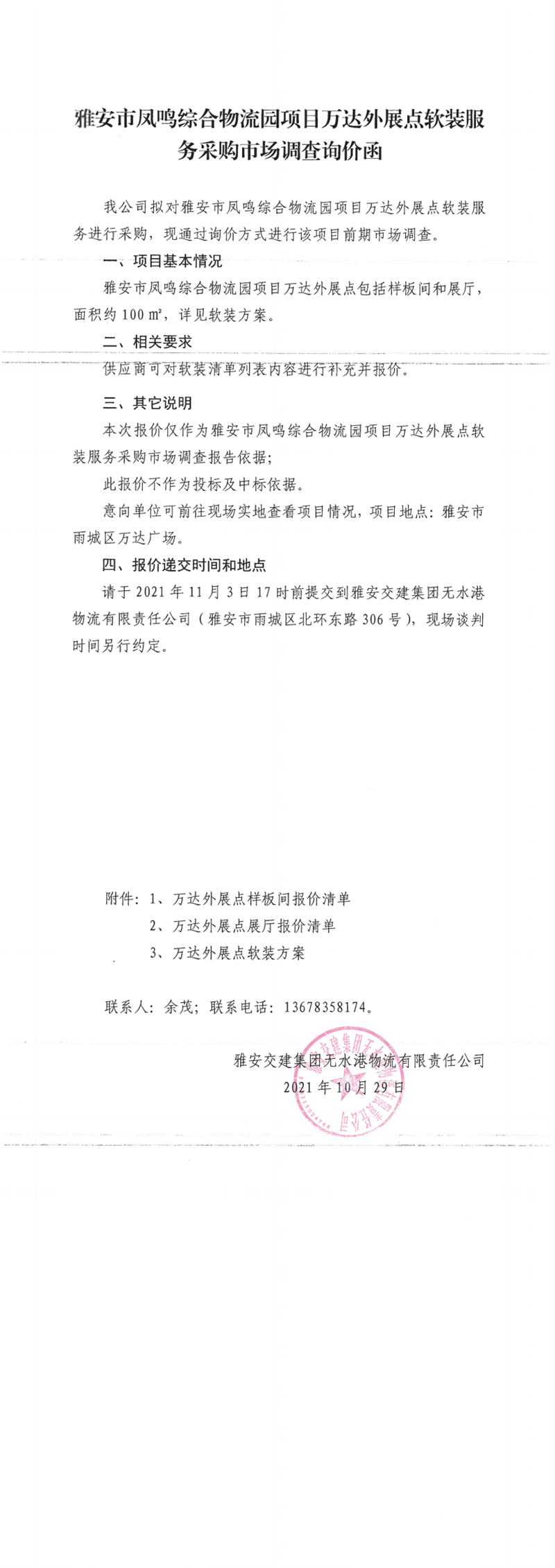 雅安交建集團無水港物流有限責任公司雅安市鳳鳴綜合物流園項目萬達外展點軟裝服務采購市場調查詢價函