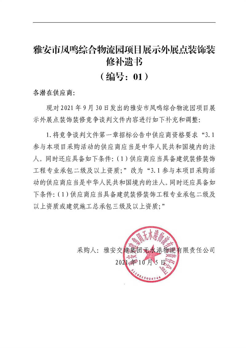 雅安交建集團(tuán)無水港物流有限責(zé)任公司雅安市鳳鳴綜合物流園項目展示外展點裝飾裝修補(bǔ)遺書