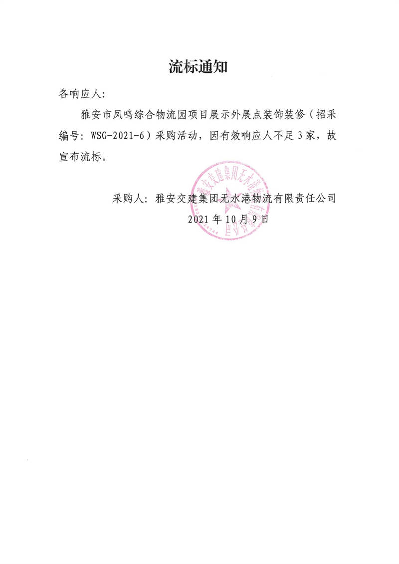 雅安交建集團無水港物流有限責(zé)任公司雅安市鳳鳴綜合物流園項目展示外展點裝飾裝修流標(biāo)通知