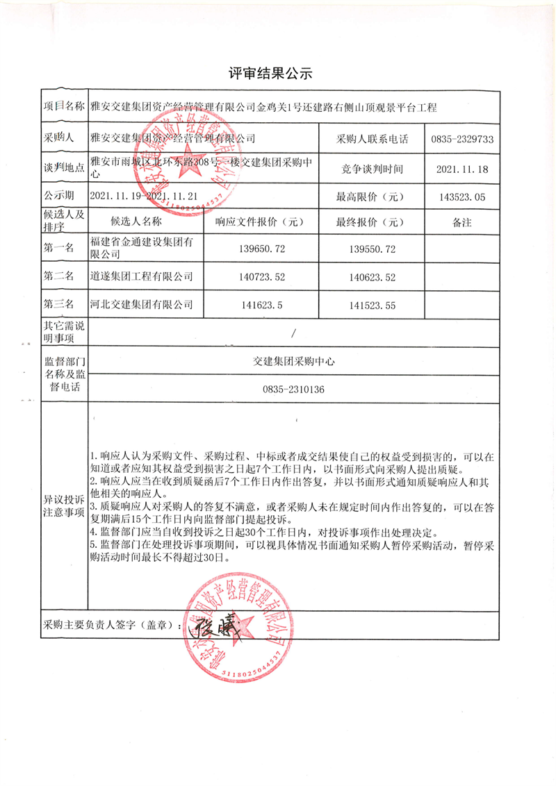 雅安交建集團資產經營管理有限公司金雞關1號還建路右側山頂觀景平臺工程評審結果公示