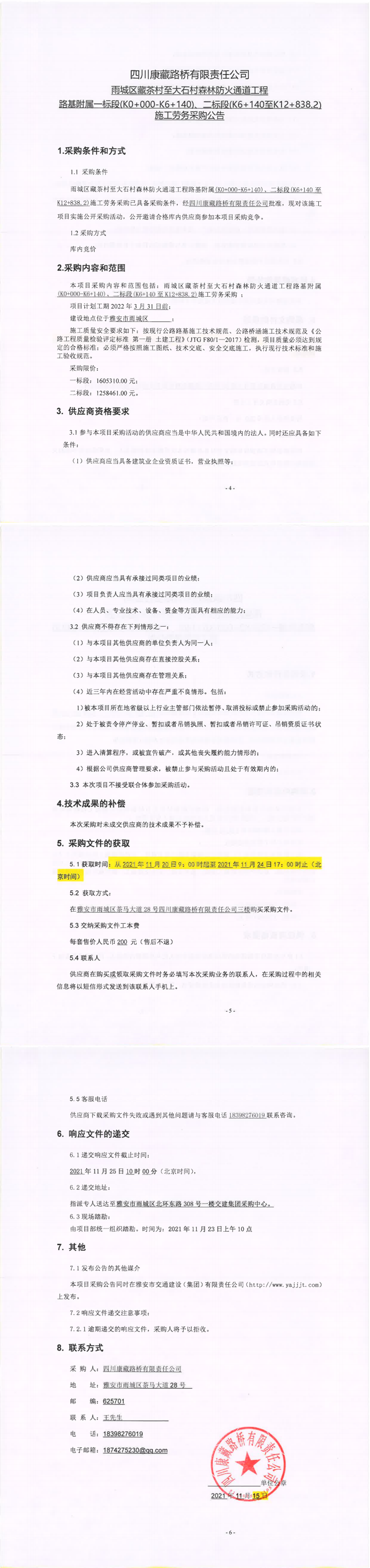 四川康藏路橋有限責(zé)任公司雨城區(qū)藏茶村至大石村森林防火通道工程路基附屬一標(biāo)段(K0+000-K6+140)、二標(biāo)段(K6+140至K12+838.2)施工勞務(wù)采購(gòu)公告