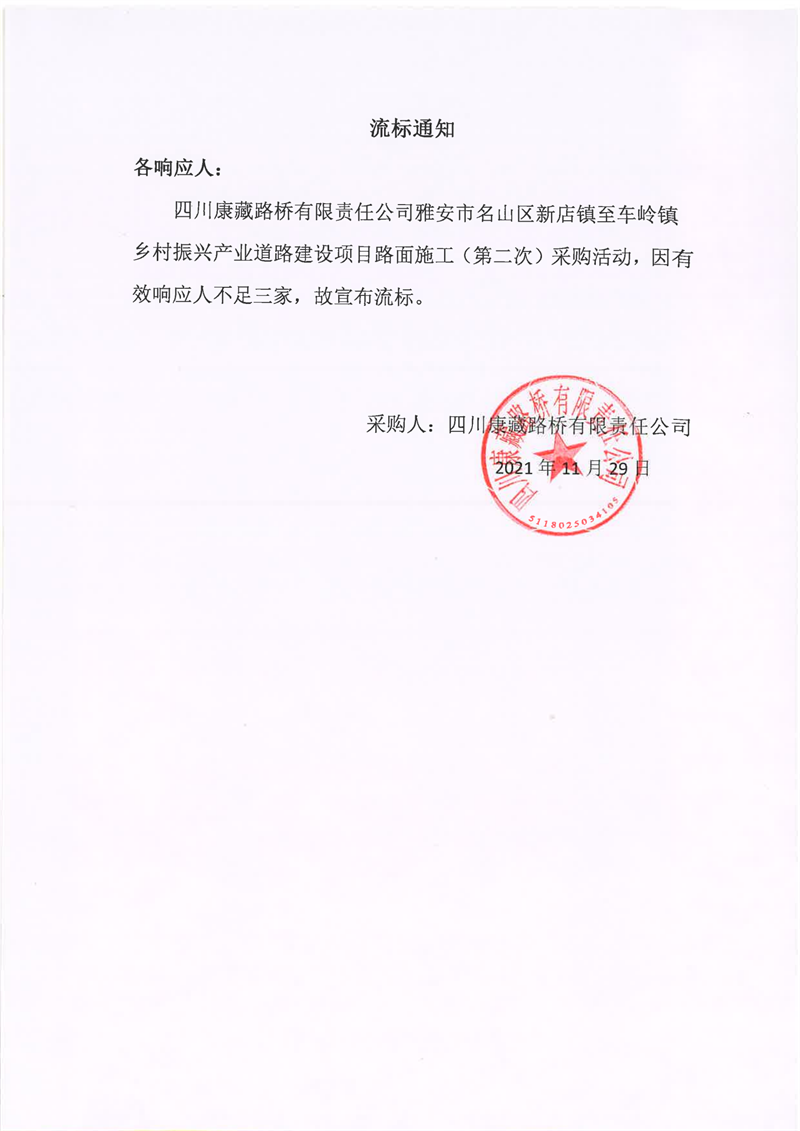 四川康藏路橋有限責(zé)任公司雅安市名山區(qū)新店鎮(zhèn)至車(chē)嶺鎮(zhèn)鄉(xiāng)村振興產(chǎn)業(yè)道路建設(shè)項(xiàng)目路面施工(第二次)流標(biāo)通知