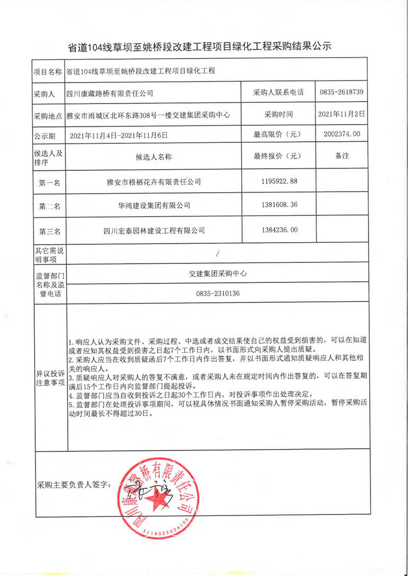 四川康藏路橋有限責(zé)任公司省道104線(xiàn)草壩至姚橋段改建工程項(xiàng)目綠化工程采購(gòu)結(jié)果公示