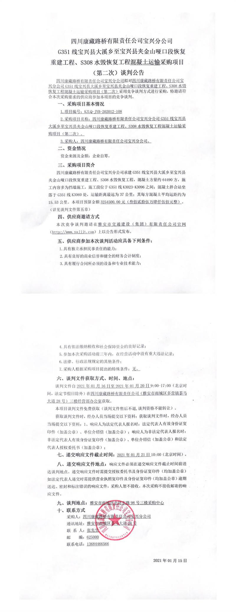 四川康藏路橋有限責(zé)任公司寶興分公司G351線寶興縣大溪鄉(xiāng)至寶興縣夾金山啞口段恢復(fù)重建工程、S308水毀恢復(fù)工程混凝土運(yùn)輸采購(gòu)項(xiàng)目(第二次)談判公告