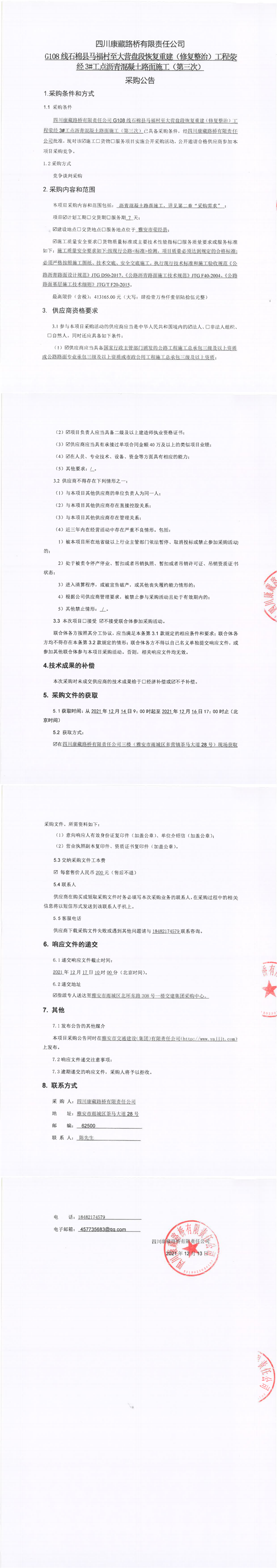 四川康藏路橋有限責(zé)任公司G108線石棉縣馬福村至大營盤段恢復(fù)重建(修復(fù)整治)工程滎經(jīng)3#工點(diǎn)瀝青混凝土路面施工(第三次)采購公告