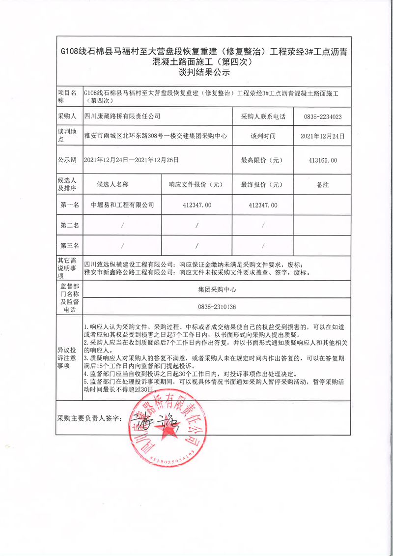 四川康藏路橋有限責(zé)任公司G108線(xiàn)石棉縣馬福村至大營(yíng)盤(pán)段恢復(fù)重建(修復(fù)整治)工程滎經(jīng)3#工點(diǎn)瀝青混凝土路面施工(第四次)談判結(jié)果公示