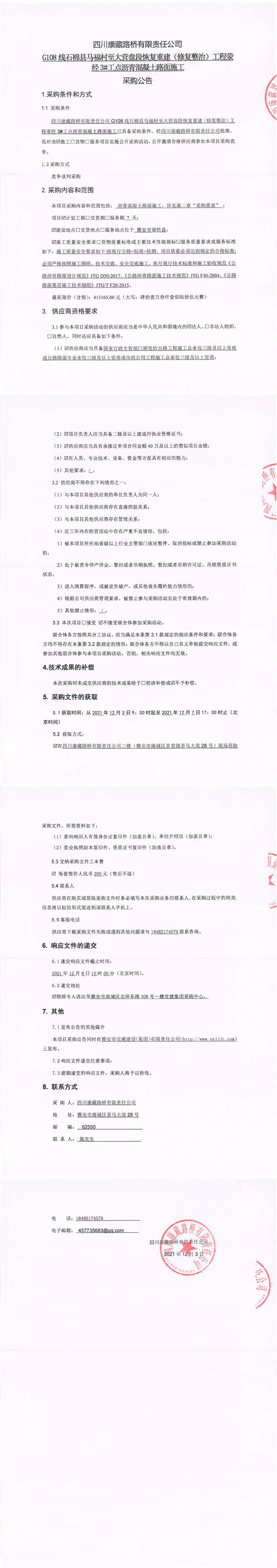 四川康藏路橋有限責任公司G108線石棉縣馬福村至大營盤段恢復(fù)重建(修復(fù)整治)工程滎經(jīng)3#工點瀝青混凝土路面施工采購公告