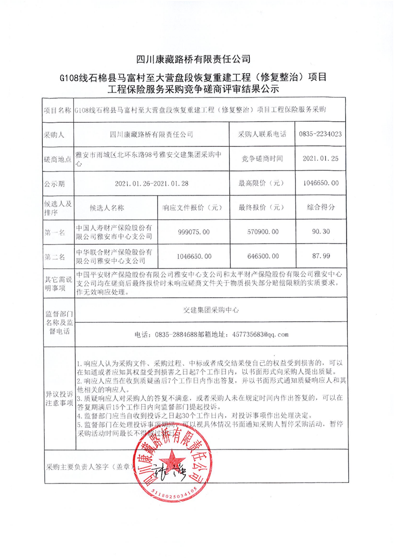 四川康藏路橋有限責(zé)任公司G108線石棉縣馬富村至大營(yíng)盤(pán)段恢復(fù)重建工程(修復(fù)整治)項(xiàng)目工程保險(xiǎn)服務(wù)采購(gòu)競(jìng)爭(zhēng)磋商評(píng)審結(jié)果公示