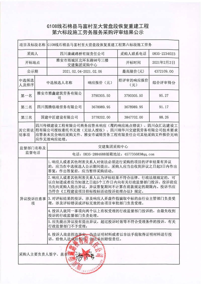 四川康藏路橋有限責(zé)任公司G108線石棉縣馬富村至大營(yíng)盤(pán)段恢復(fù)重建工程第六標(biāo)段施工勞務(wù)服務(wù)采購(gòu)評(píng)審結(jié)果公示