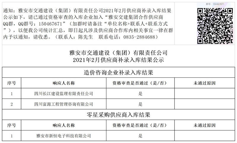 雅安市交通建設(shè)(集團(tuán))有限責(zé)任公司2021年2月供應(yīng)商補錄入庫結(jié)果公示