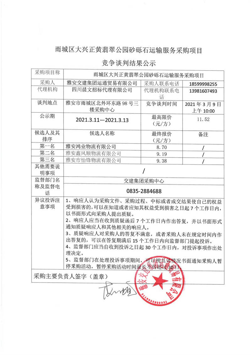 雅安交建集團運通貿易有限公司雨城區(qū)大興正黃翡翠公園砂礫石運輸服務采購項目競爭談判結果公示