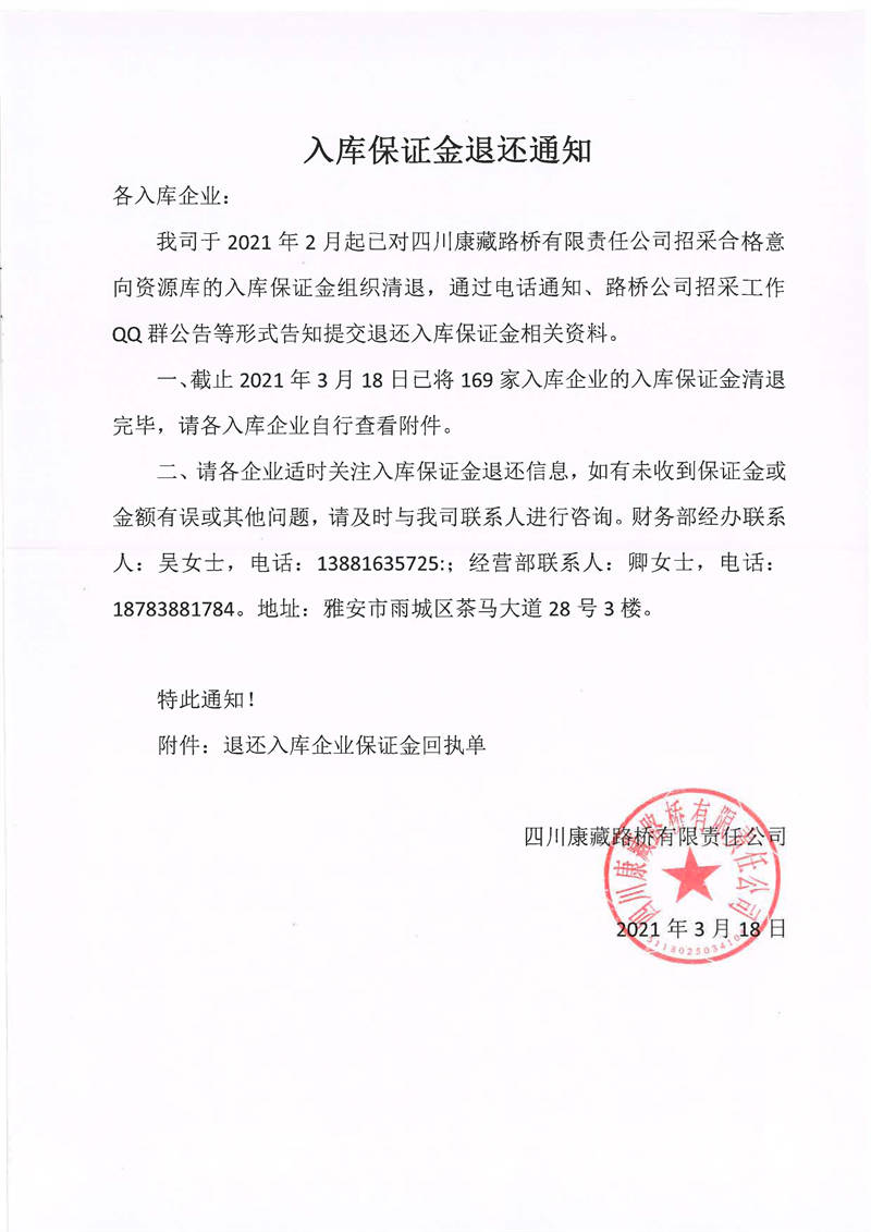 四川康藏路橋有限責任公司入庫保證金退還通知
