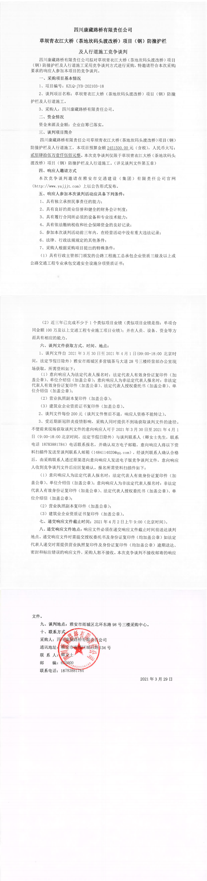 四川康藏路橋有限責(zé)任公司草壩青衣江大橋(茶地坎碼頭渡改橋)項(xiàng)目(鋼)防撞護(hù)欄及人行道施工競爭談判公告