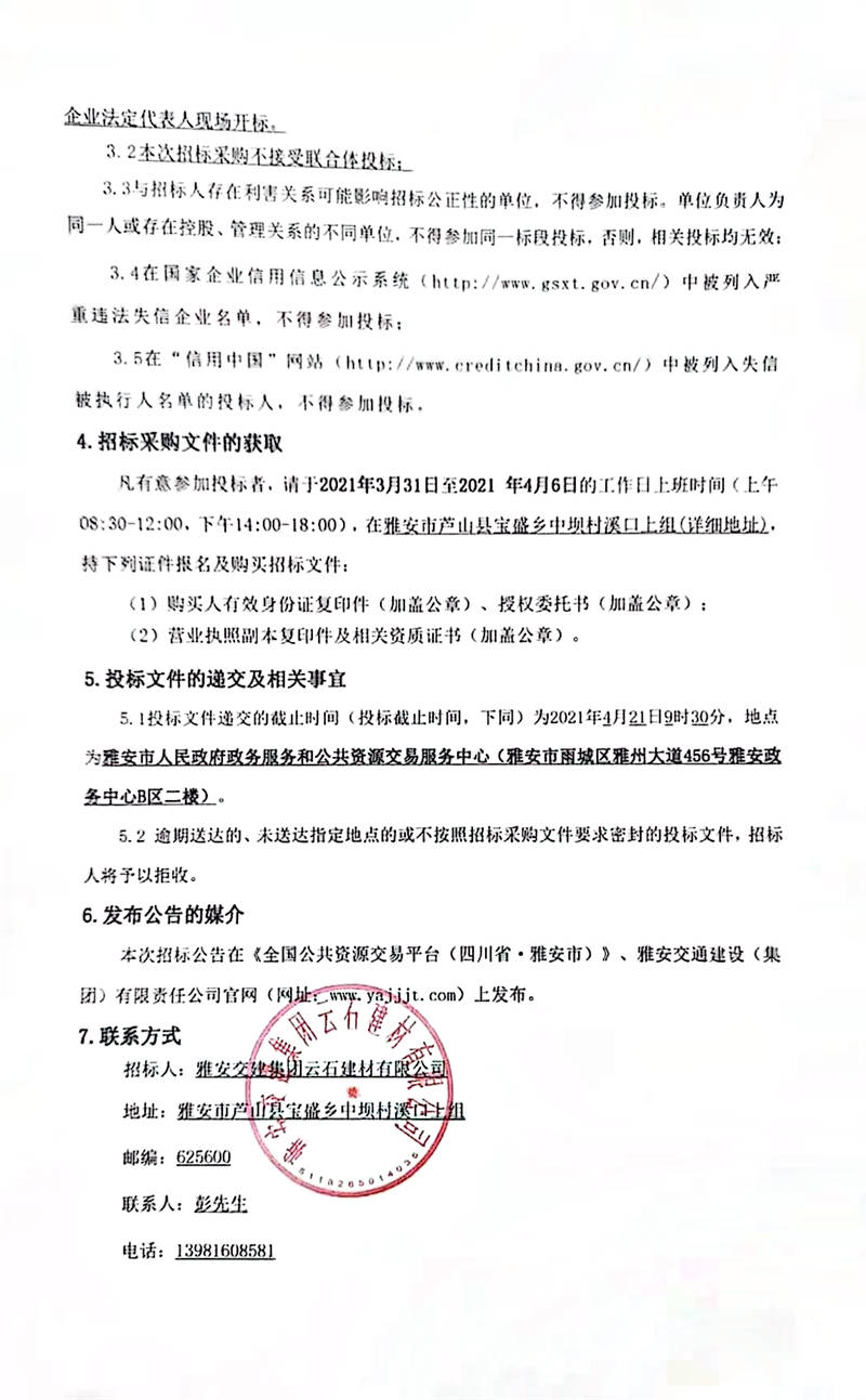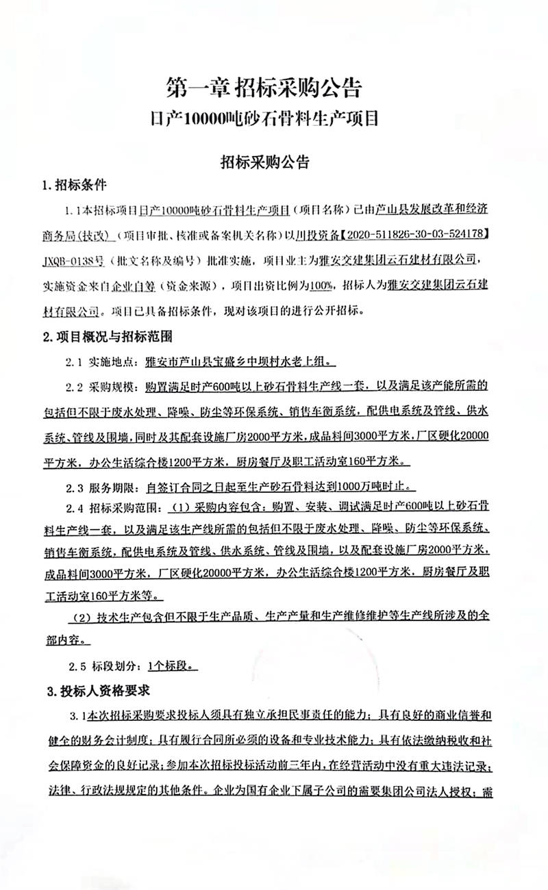 雅安交建集團云石建材有限公司日產(chǎn)10000噸砂石骨料生產(chǎn)項目招標(biāo)采購公告
