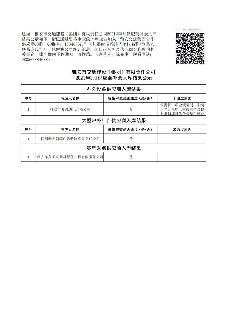 雅安市交通建設(shè)(集團)有限責任公司2021年3月供應(yīng)商補錄入庫結(jié)果公示