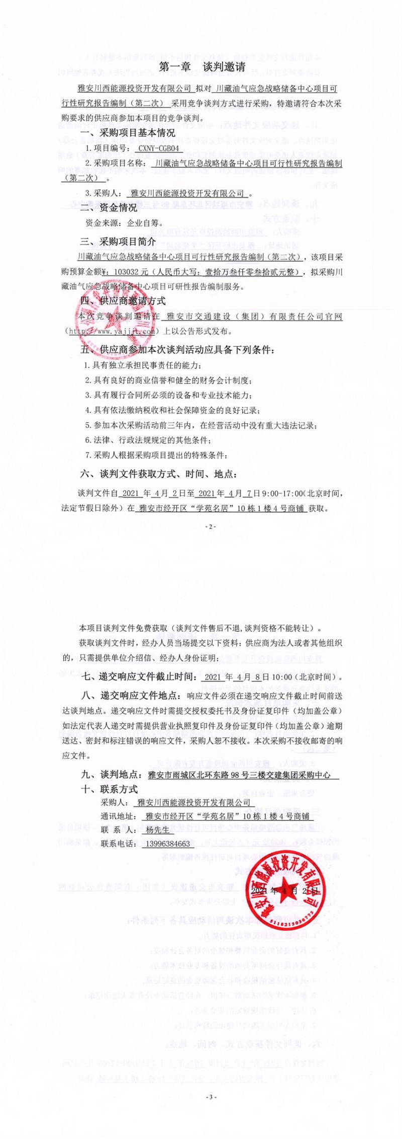 雅安川西能源投資開發(fā)有限公司川藏油氣應(yīng)急戰(zhàn)略儲(chǔ)備中心項(xiàng)目可行性研究報(bào)告編制(第二次)競(jìng)爭談判公告