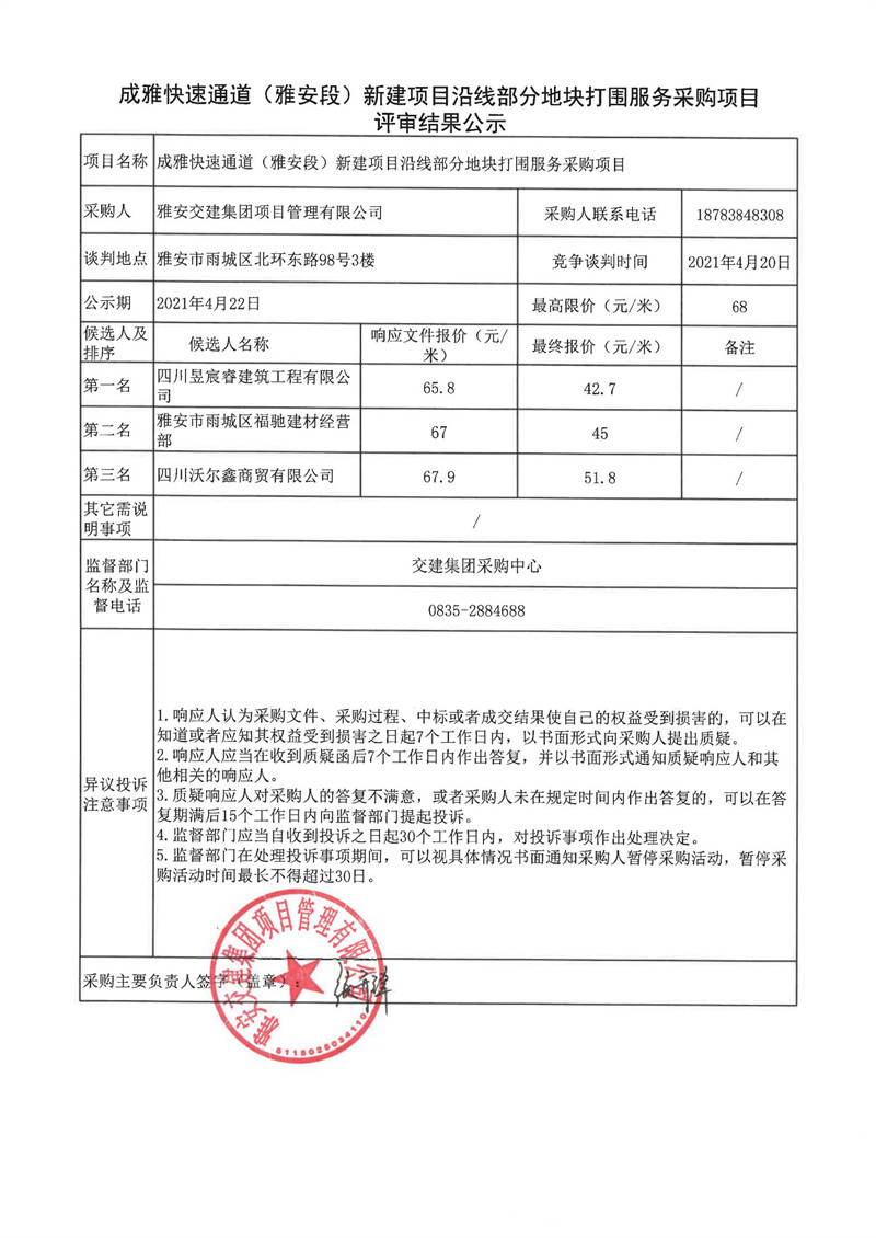 雅安交建集團項目管理有限公司成雅快速通道(雅安段)新建項目沿線部分地塊打圍服務采購項目評審結(jié)果公示