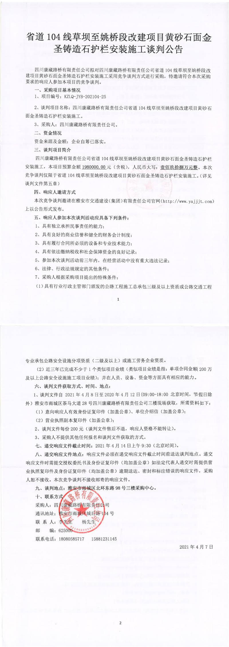 四川康藏路橋有限責(zé)任公司省道104線草壩至姚橋段改建項目黃砂石面金圣鑄造石護欄安裝施工談判公告