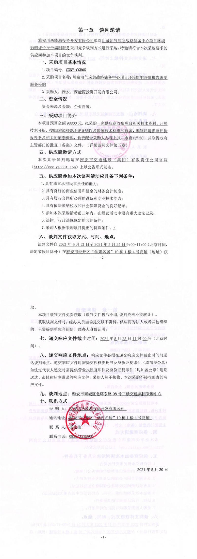 雅安川西能源投資開發(fā)有限公司川藏油氣應(yīng)急戰(zhàn)略儲(chǔ)備中心項(xiàng)目環(huán)境影響評(píng)價(jià)報(bào)告編制服務(wù)采購競爭談判公告