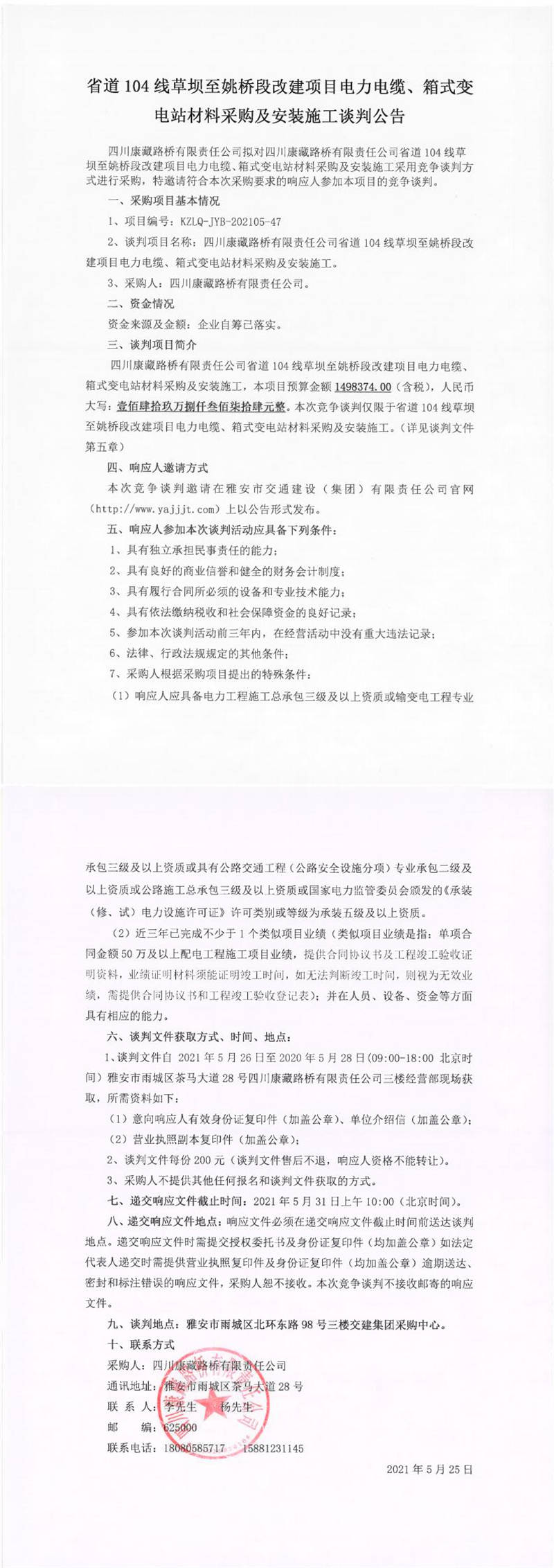 四川康藏路橋有限責(zé)任公司省道104線草壩至姚橋段改建項目電力電纜、箱式變電站材料采購及安裝施工談判公告