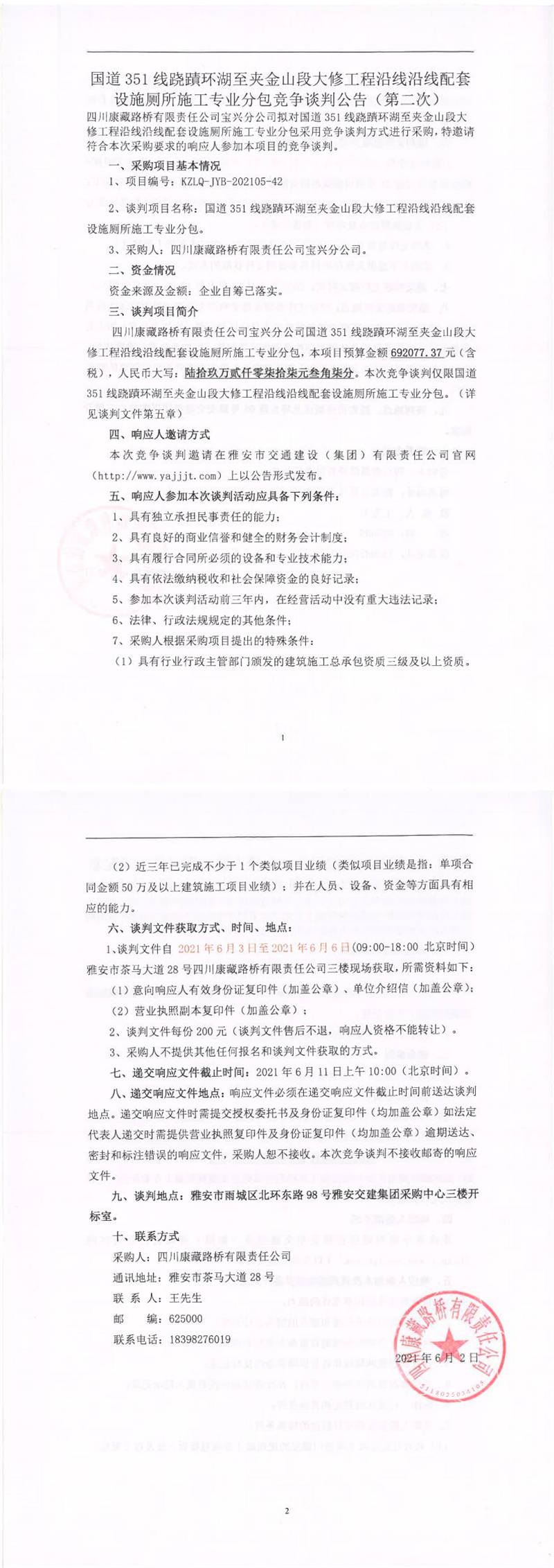 四川康藏路橋有限責任公司寶興分公司國道351線蹺磧環(huán)湖至夾金山段大修工程沿線沿線配套設(shè)施廁所施工專業(yè)分包競爭談判公告(第二次)