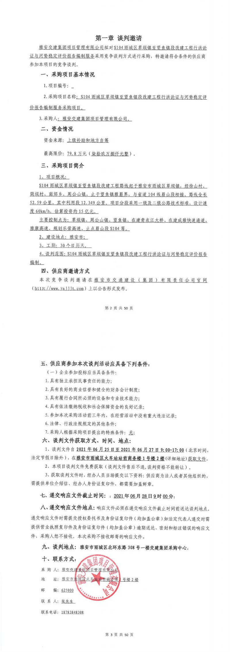 雅安交建集團(tuán)項(xiàng)目管理有限公司S104雨城區(qū)草壩鎮(zhèn)至望魚鎮(zhèn)段改建工程行洪論證與河勢穩(wěn)定評(píng)價(jià)報(bào)告編制服務(wù)采購項(xiàng)目競爭談判公告