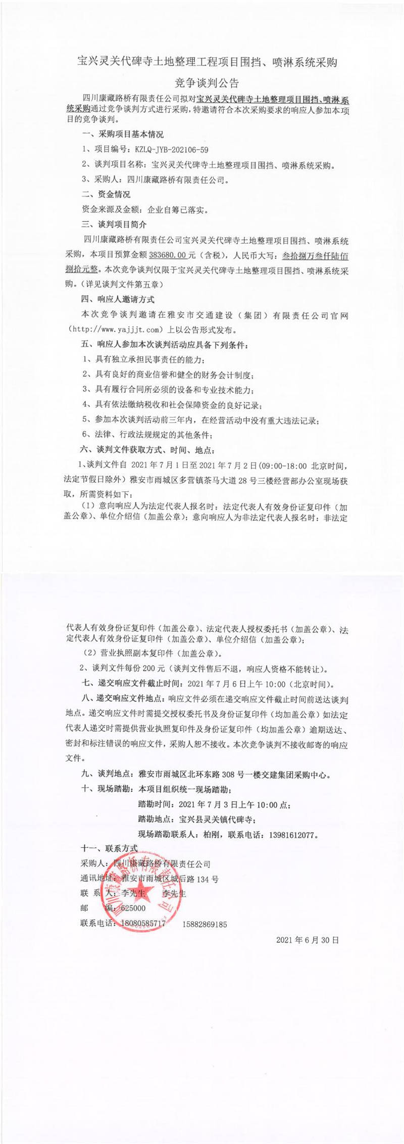 四川康藏路橋有限責(zé)任公司寶興靈關(guān)代碑寺土地整理工程項(xiàng)目圍擋、噴淋系統(tǒng)采購競(jìng)爭(zhēng)談判公告
