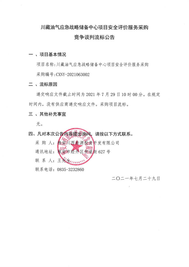雅安川西能源投資開(kāi)發(fā)有限公司川藏油氣應(yīng)急戰(zhàn)略儲(chǔ)備中心項(xiàng)目安全評(píng)價(jià)服務(wù)采購(gòu)競(jìng)爭(zhēng)談判流標(biāo)公告