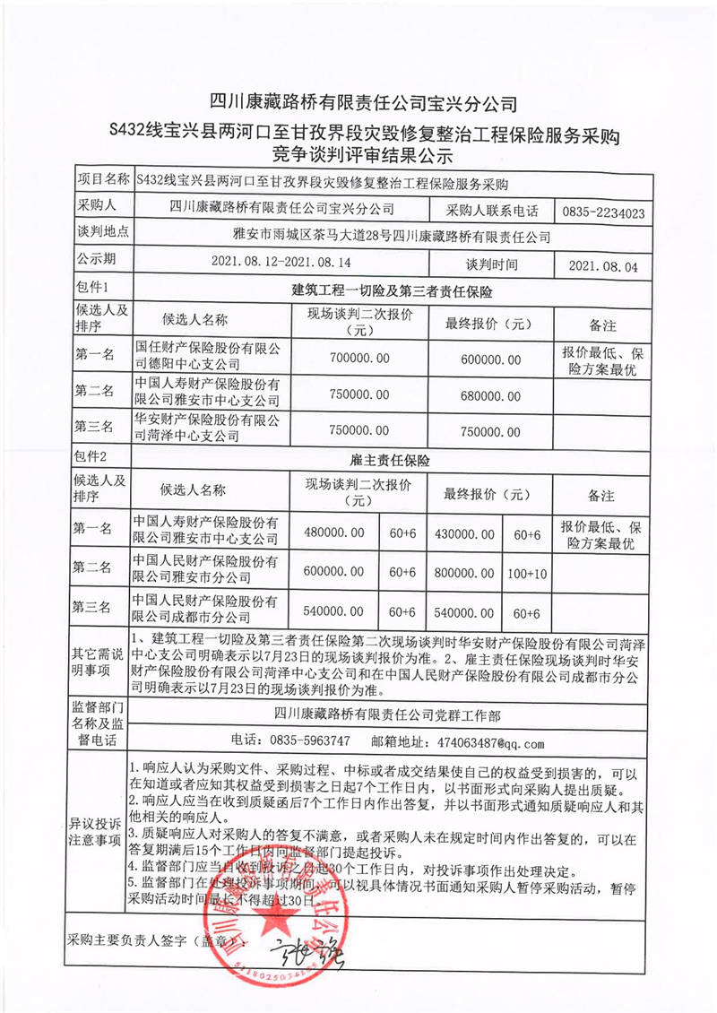 四川康藏路橋有限責(zé)任公司寶興分公司S432線寶興縣兩河口至甘孜界段災(zāi)毀修復(fù)整治工程保險(xiǎn)服務(wù)采購競爭談判評審結(jié)果公示