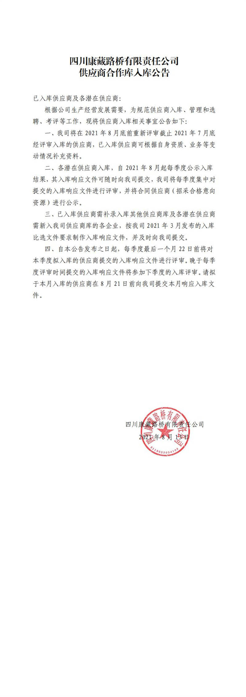 四川康藏路橋有限責(zé)任公司供應(yīng)商合作庫入庫公告