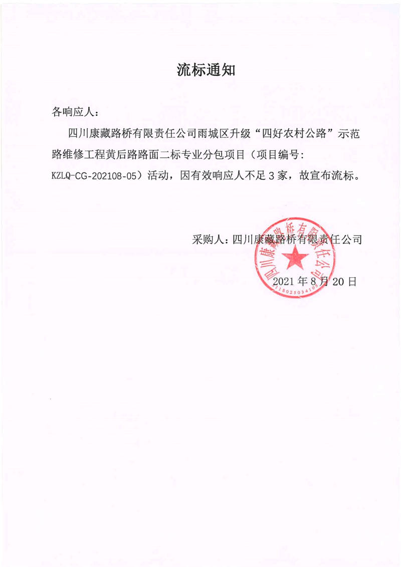 四川康藏路橋有限責(zé)任公司雨城區(qū)升級“四好農(nóng)村公路”示范路維修工程黃后路路面二標專業(yè)分包項目流標通知